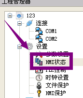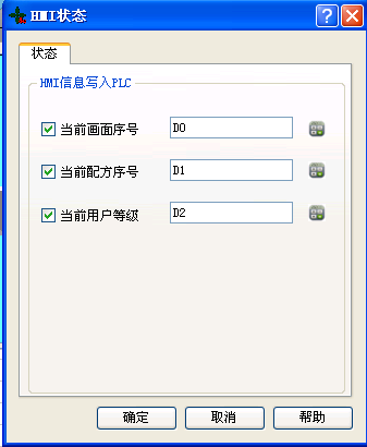 HMI人机状态设置,即把HMI当前的状态信息写入到PLC的数据寄存器中。 双击“工程管理器”中的“HMI状态”选项,弹出如下图所示对话框: