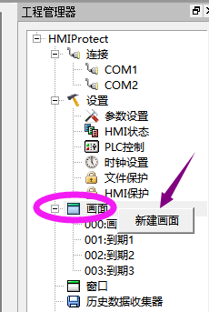 在“工程管理器”中的“画面”处单击右键,弹出如下图所示对话框: