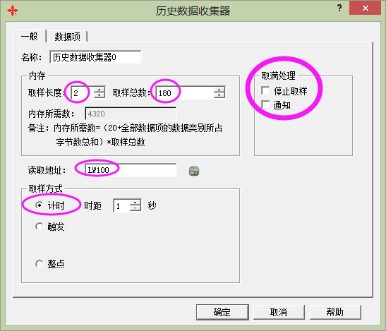 采集达到取样数的一定百分比时,通知某一个触点开关地址设1,如果勾选此项,那上图表示采集到90%后(即90组数据),将通知一个PLC位地址。