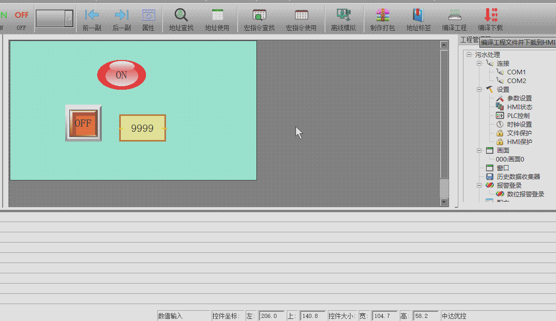 在创建完毕工程后,开始设计组态界面,绘制好图形后,插入下载线到背面方口,可以单击工具栏"编译下载",将开始编译并下载到触摸屏。