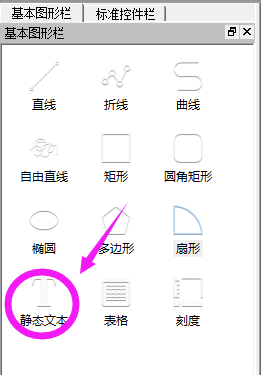 1、打开软件之后,点基本图形栏,左键单击"静态文本",绘图区单击左键,即可添加: