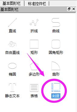 1、打开软件之后,点基本图形栏,左键单击"刻度",绘图区单击左键,即可添加:
