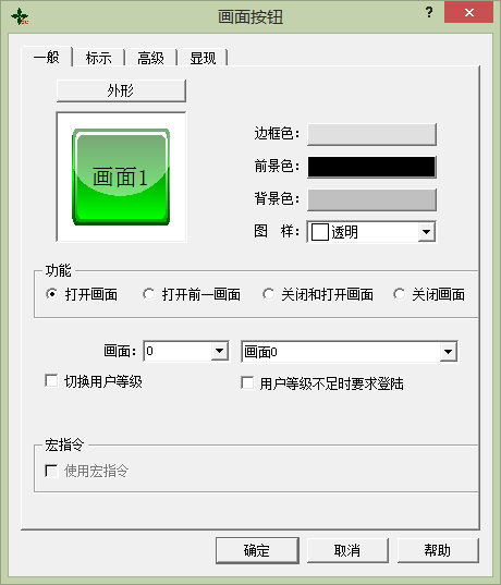 打开指定的画面,从下面的下拉框中选择序号或名称, 用户可在画面选项中选择要打开的画面, 这样用户在触摸屏中点击该按钮就可以跳转到用户所要打开的画面。 该功能可以在画面或者窗口中使用,数字编号从0开始。
