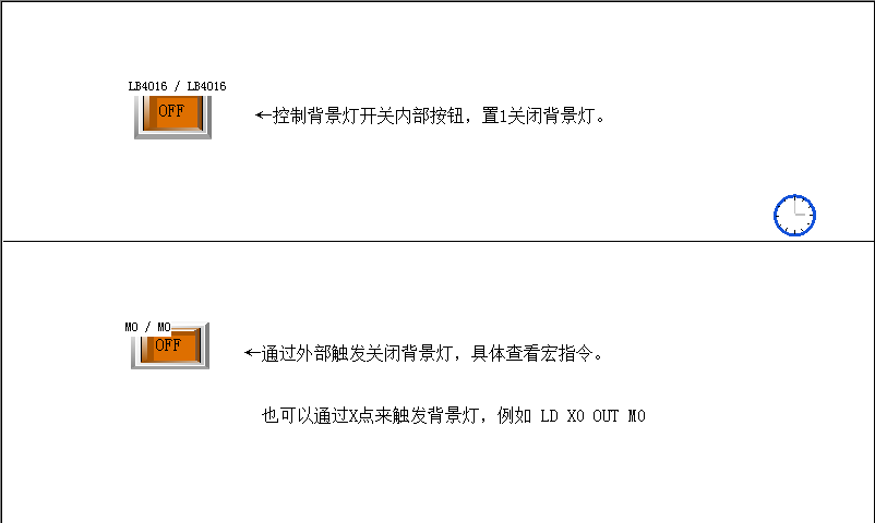 同时,也可以通过梯形图来控制M点进而实现外部输入控制背景灯,如下图所示。当X置ON,那么M0置ON,进而LB4016置ON。