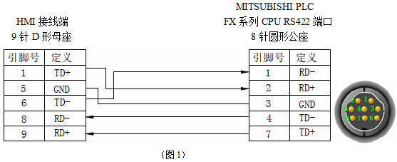 1、三菱FX0/FX1/FX1S/FX0N/FX1N/FX2N系列PLC使用RS422时,电缆制作图如下所示:,如下图: