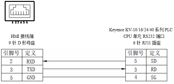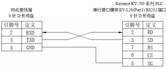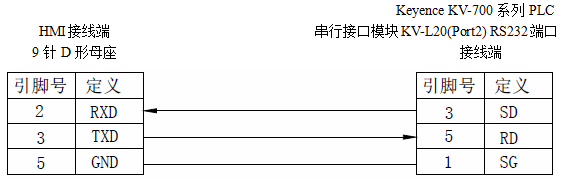 5、通过串行接口模块KV-L20(Port1,RS232)与Keyence KV-700系列PLC相连接,电缆制作图如下所示: