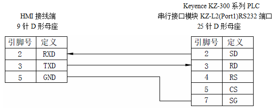2、通过串行接口模块KZ-L2(Port1,RS232)与Keyence KZ-300系列PLC相连接,电缆制作图如下所示: