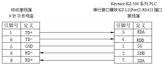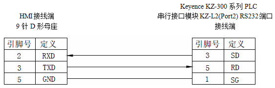 4、通过串行接口模块KZ-L2(Port2,RS232)与Keyence KZ-300系列PLC相连接,电缆制作图如下所示:
