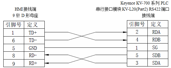 7、通过串行接口模块KV-L20(Port2,RS422)与Keyence KV-700系列PLC相连接,电缆制作图如下所示: