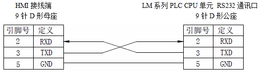 1、LM系列PLC使用RS232时,电缆制作图如下所示: