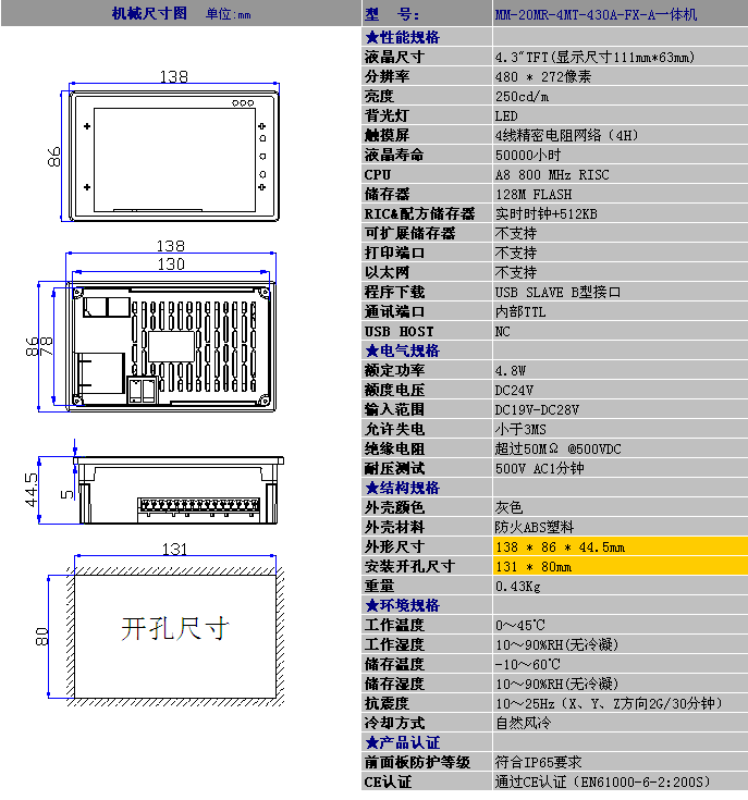 彩色触摸一体机 4.3寸一体机 MM_20MR_4MT_430A_FX_A