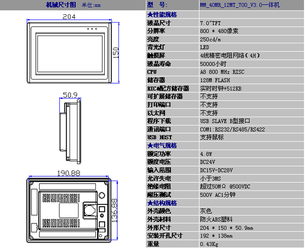 彩色触摸一体机 7寸一体机 MM_40MR_12MT_700_ES_E (台达ES2全兼容 + 4AD + 2AD + 2路热电阻 + 1路485)