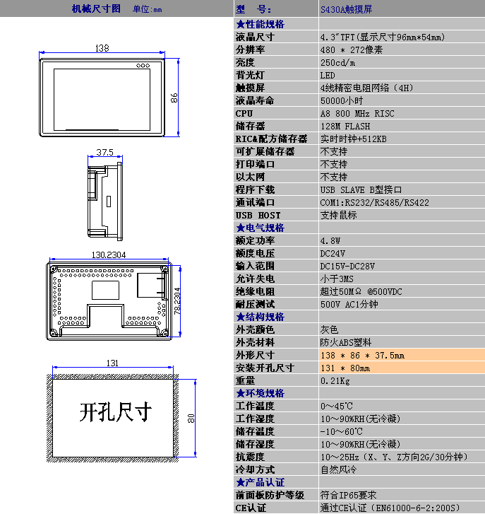 彩色触摸屏 S430A