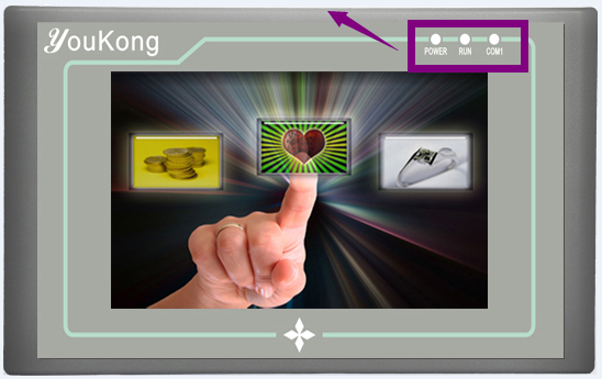 下图为YKBuilder系列触摸屏的前面板视图,包括显示屏和运行指示灯两个部分: