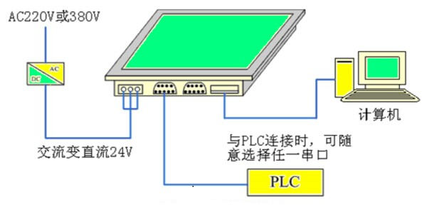 YKBuilder系列触摸屏在使用的时候, 需要DC24V直流电源供电, 与PLC和PC的连接可按下图所示来连接:
