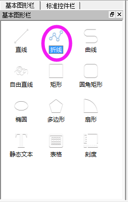 1、打开软件之后,点基本图形栏,左键单击"折线",绘图区单击左键,即可添加: