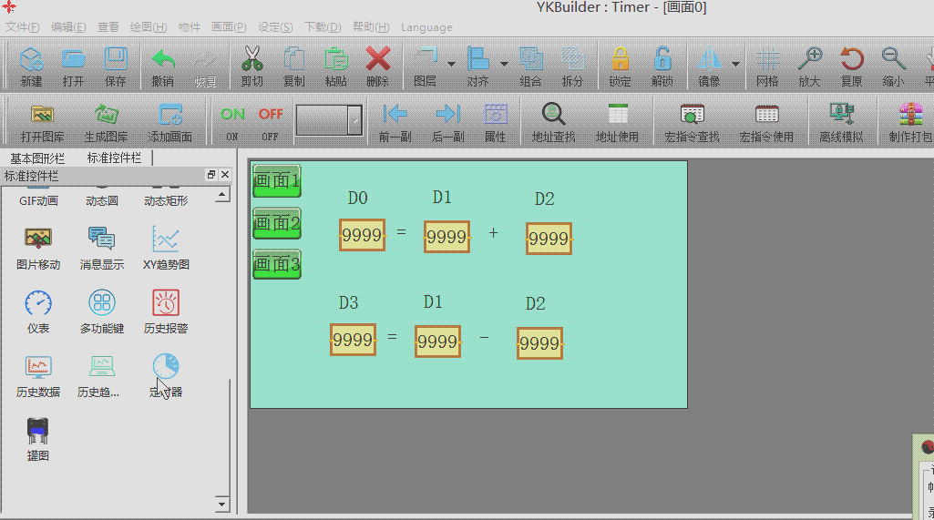 定时器的作用:定时执行一段宏指令代码,一般按指定次数、无限次数或受位地址控制来执行, 使用前请先新键宏指令,定时器的宏指令仅所在画面有效,其他画面则换效, 如果需要所有画面有效的宏指令,请使用设定/全局宏。