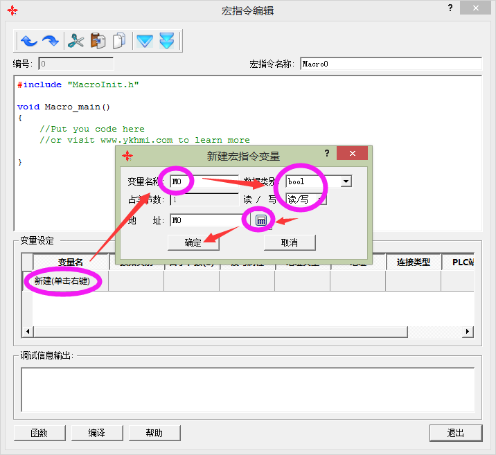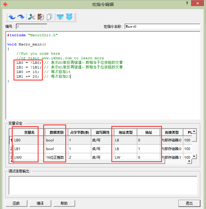 2、如下图所示,添加LB0、LB1、LW0、LW1四变量,下面的代码表示触发宏指令时,LB0、LB1分别取反再赋值,即相当于位按钮的交替功能;