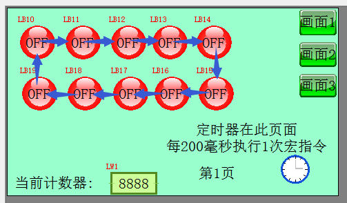 ,用内部寄存器LW1地址每次自加1,最大加到10则为0,最后比较LW1的值分别设定哪一个LB灯灯,而循环每200毫秒执行一次,这样的话10个灯将每秒依次亮一个。