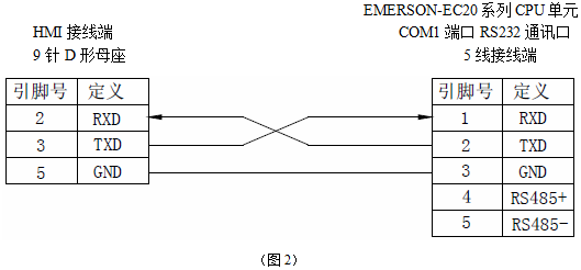 2、与艾默生EC20系列PLC连接,使用COM1通讯口(RS232)时,电缆制作图如下所示:
