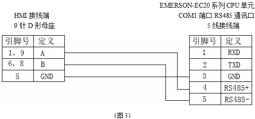3、与艾默生EC20系列PLC连接,使用COM1通讯口(RS485)时,电缆制作图如下所示: