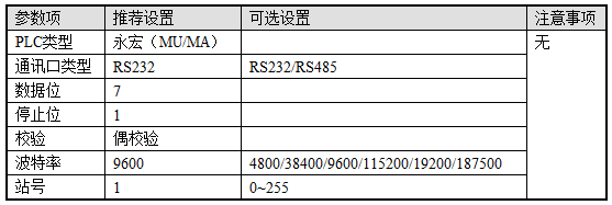 2、永宏FPS/MU/MA协议默认通讯参数: