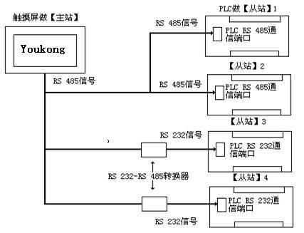 YKHMI系列触摸屏不仅可以“一机多屏”的连接方式,还可以支持以MODBUS协议为通信协议的PLC的“一屏多机”的连接方式。