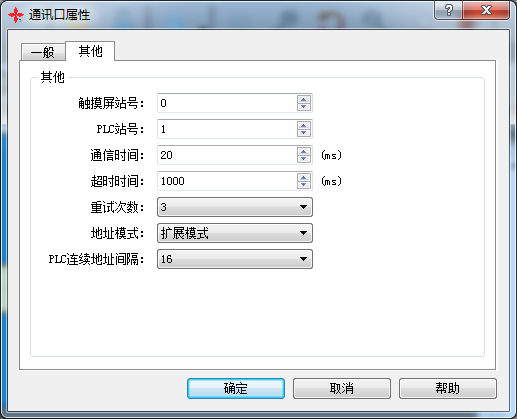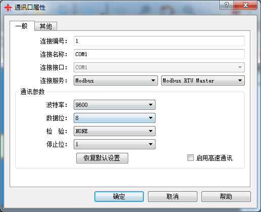的通信口属性的“一般”选项内设备服务项上选择Modbus RTU,右边选择Modbus RTU Mster,使触摸屏做为【主站】,